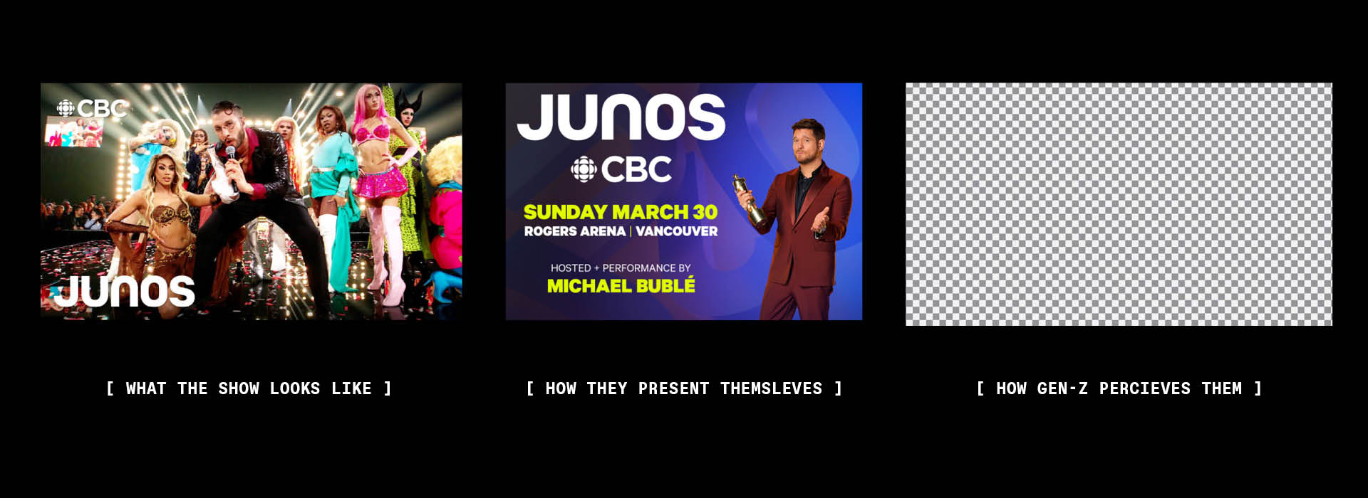 The reimagined JUNOs identity pushed the awards show closer to a live, festival-driven experience that feels aligned with how younger audiences engage with music today. Beyond the visual system, the project led to technical exploration as well. I designed and programmed a tool that generated consistent brand elements across different applications using code and AI, and built a custom typographic motion tool to translate sound into movement. Working alongside Sachin Tartamella, there was a strong sense of unity and creative harmony that made experimentation feel natural and collaborative.