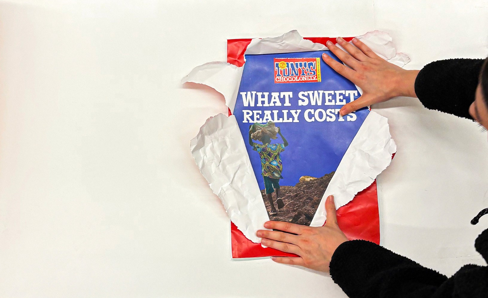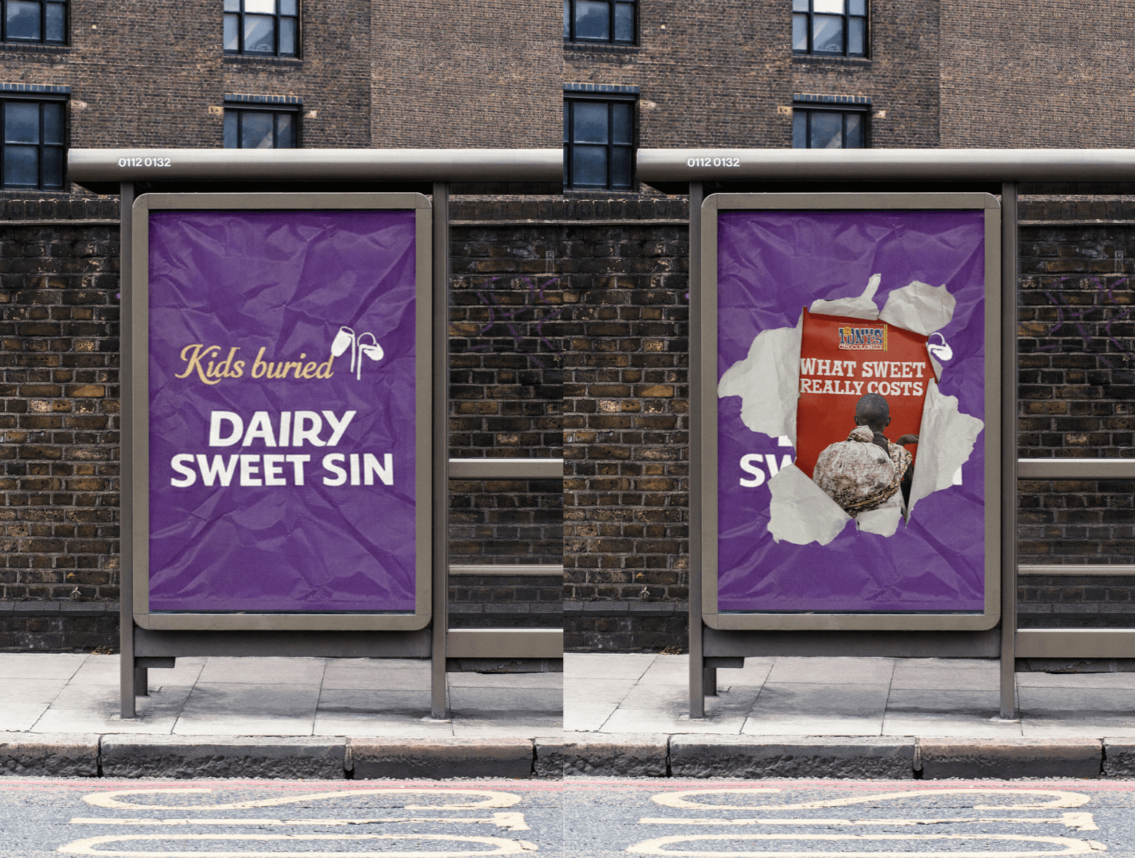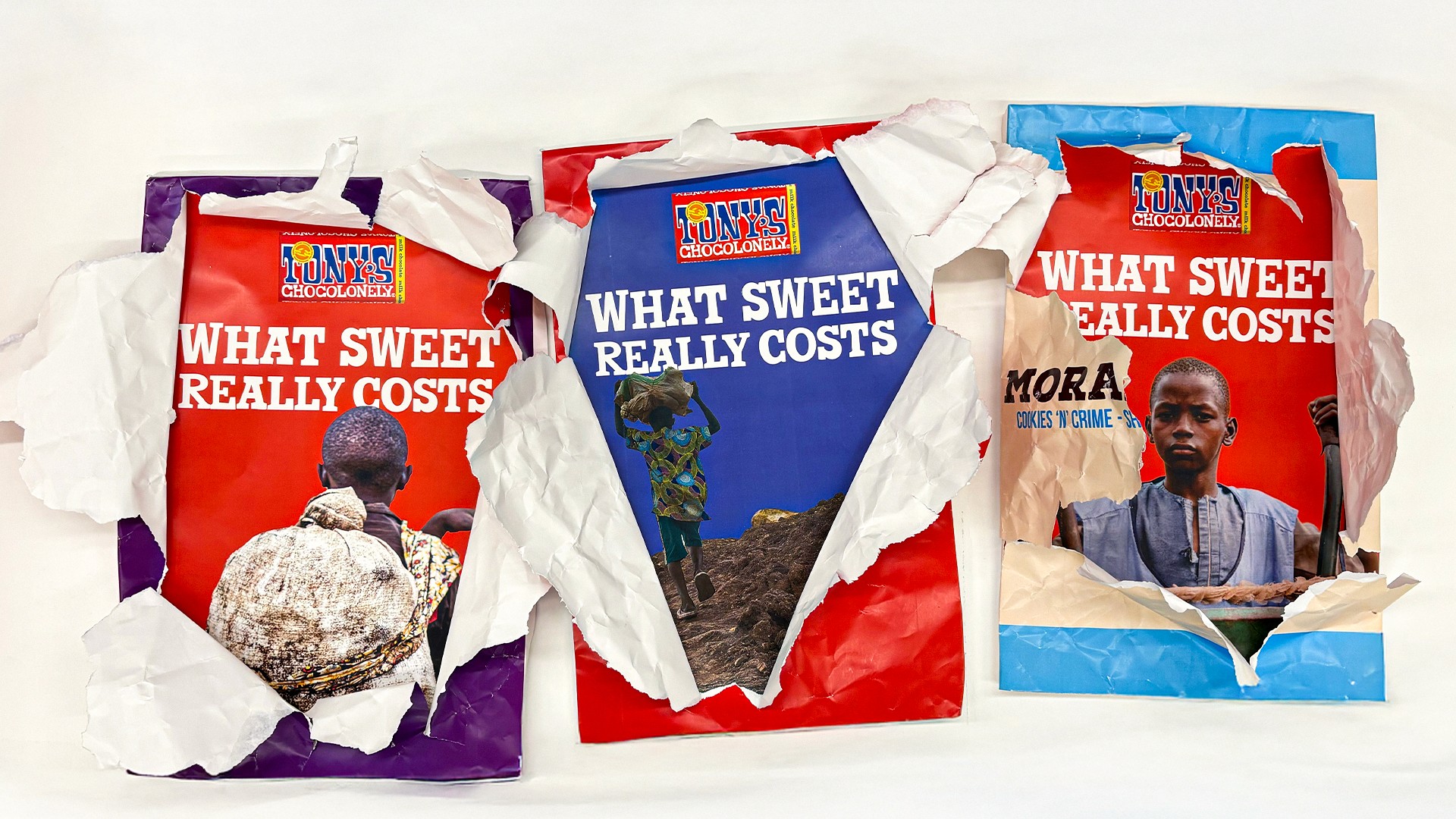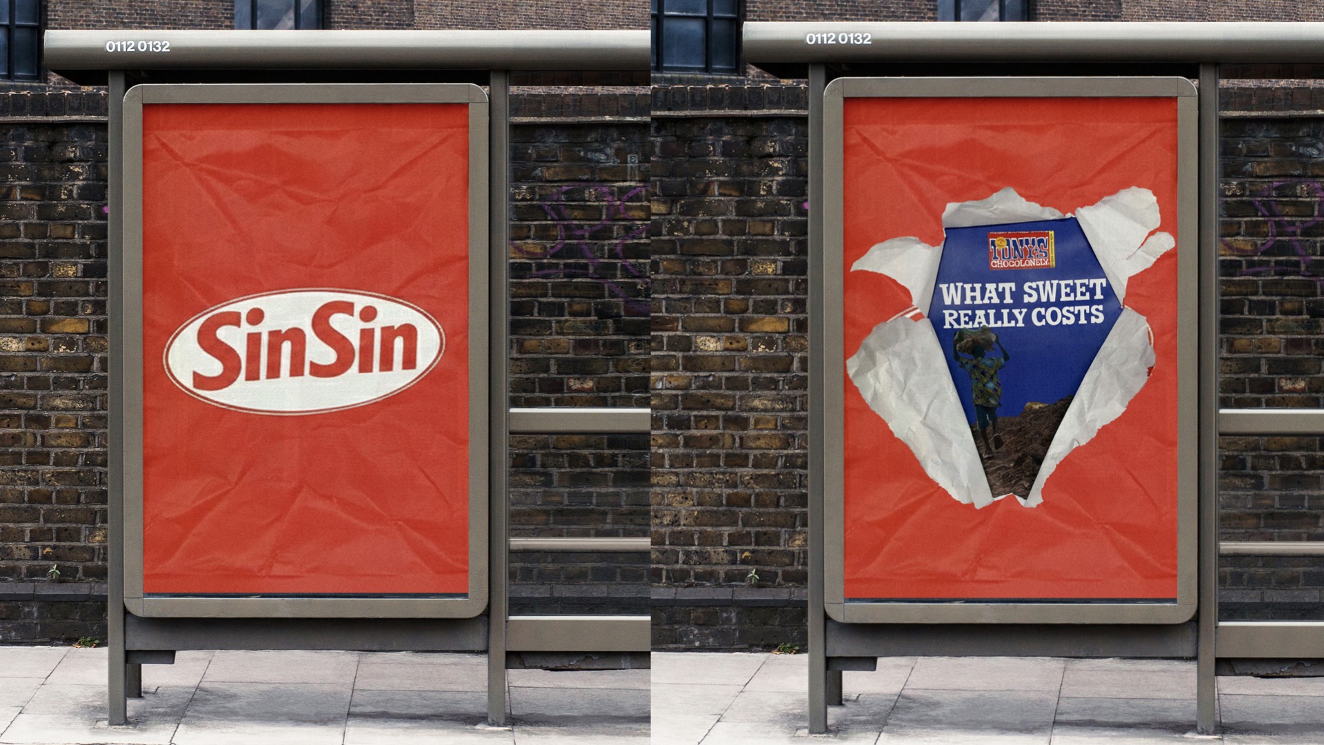Crumbled posters of familiar chocolate brands expose the hidden truth through bold copy.